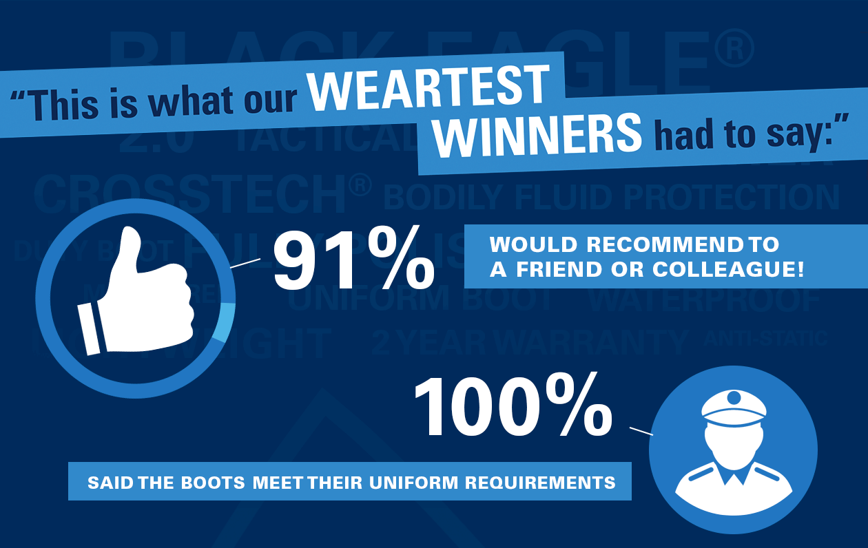 The new Black Eagle® Tactical 2.0 FL was put to the test and the results are in! Last spring HAIX® launched a weartest contest where 200 lucky winners were chosen to test out the new Black Eagle® Tactical 2.0 FL and give us their honest impressions of our new boot. Potential weartesters must have been active in law enforcement and were chosen at random after signing up online. Weartest winners were asked to wear their boots on the job for 4-6 weeks, and then give us their feedback. Feedback questions focused on comfort, durability, and slip resistance.